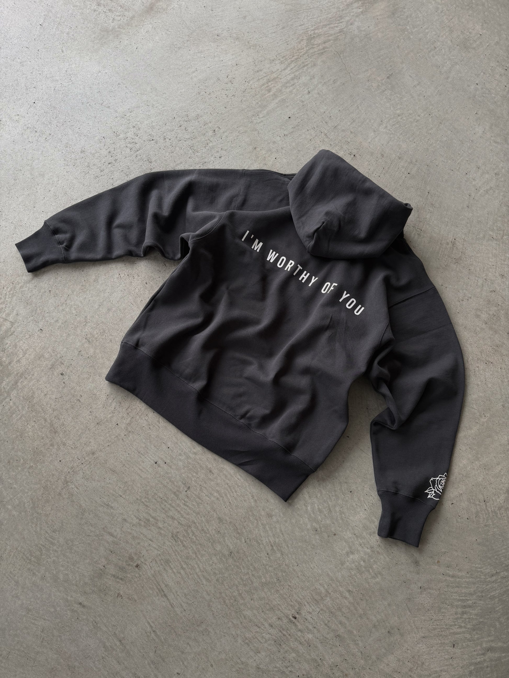白い薔薇の花言葉、" I'M WORTHY OF YOU " を背面へプリント。